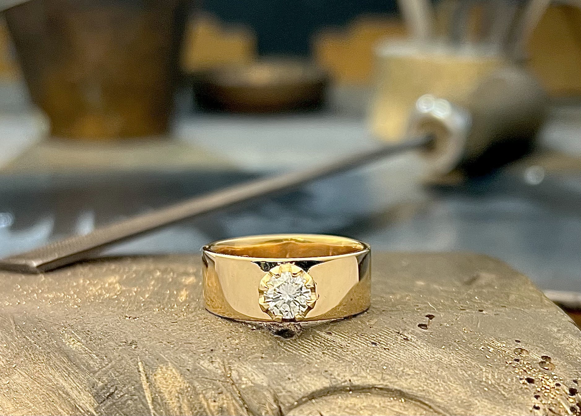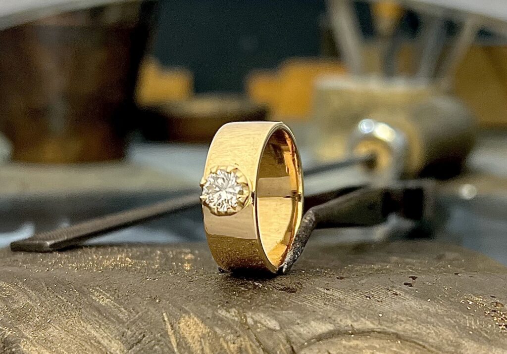 Muutama vuosi sitten Tainan Äidin, sekä Isän kihla- ja vihkisormukset päätyivät Sormusten Herran verstaalle sulatettavaksi ja sehän tarkoittaa yleensä, että jotain uutta valmistuu…niin nytkin. Tunnepitoisista sormuksista syntyi yksi uusi, joka oli leveä, paksu, sekä painava ja vaikka kuva sormuksesta niin väittääkin, ei siihen istutettu lainkaan kiveä. Upea, ja yli karaatin kokoinen timantti nimittäin istutettiin sormukseen vasta parin vuoden käytön jälkeen ja on myös erityinen. Se on nimittäin äidinäidin, eli Mummun vanhasta sormuksesta peräisin, joten nyt Tainan sormessa kulkee mukana Äiti, Isä ja Mummu.