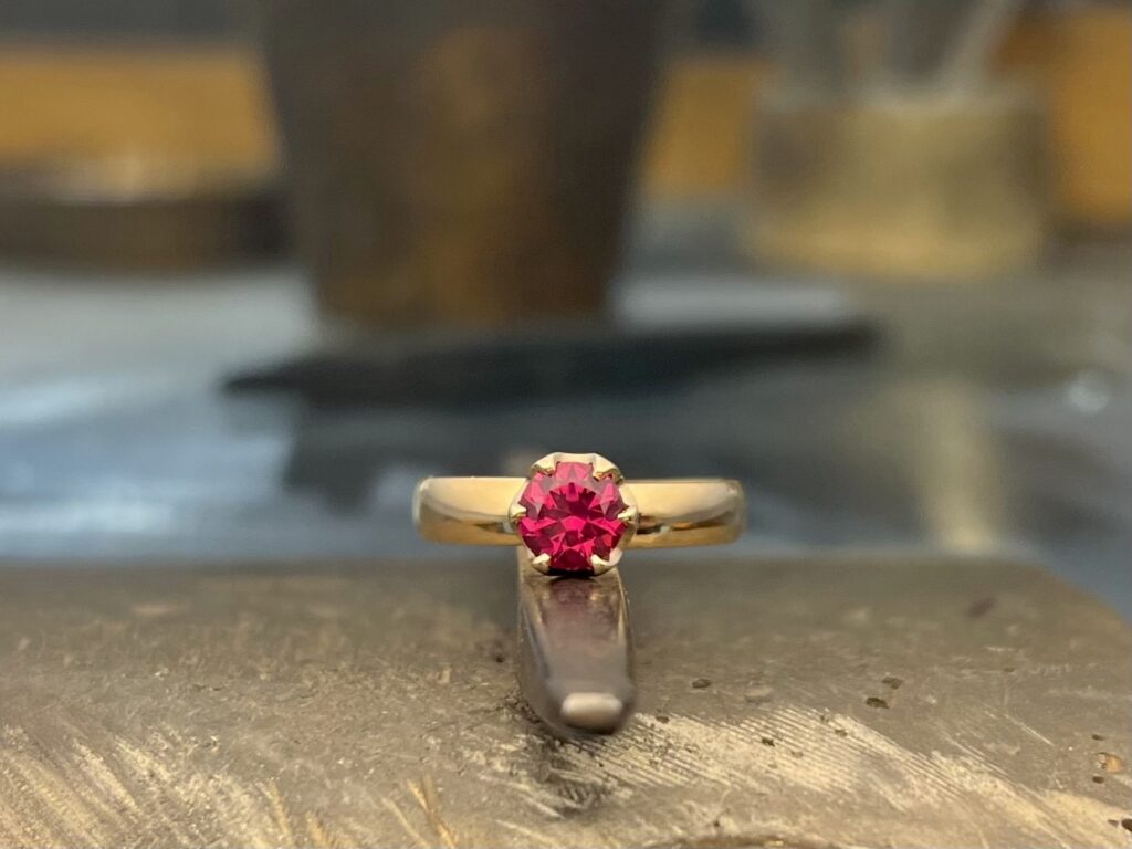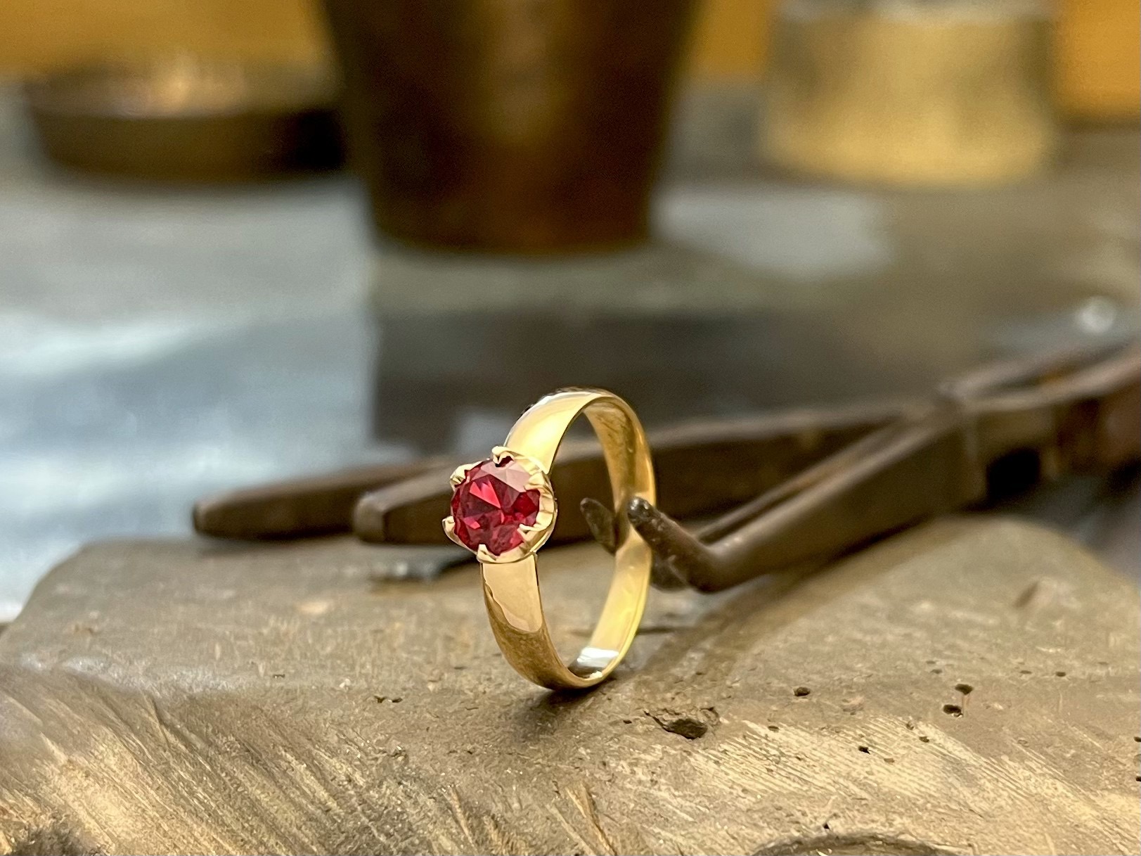 Riikan korulaatikossa odotteli oikeaa hetkeä sormus, joka oli tärkeä ja tunnearvoinen, mutta ei sellaisenaan ollut kelvollinen hänen sormeensa. Tuo oikea hetki uuteen käyttöön koitti, kun Riikka meni naimisiin ja sormuksesta tuli vihkisormus. Sormuksen aikaisemmat käyttäjät oli Isoisä ja Isä, joten ihan ensimmäisenä sormusta piti pienentää reilusti, mutta Riikan mielestä perinteinen puolipyöreä kivetön sormus kaipasi myös uutta naisellista ilmettä. Samassa korulaatikossa uutta mahdollisuutta odotteli myös Riikan Isoäidin riipus, jonka Isoisä oli vaimolleen lahjoittanut. Tunnearvoinen koru myös siis sekin ja siitä Riikka halusi kiven sormustaan koristamaan. Riipus itsessään oli liian heiveröinen käytettäväksi sormuksessa, joten kivelle tehtiin uusi kiviosa, eli ”kastikka” ja kuten kuvasta näkyy on tämä pieni muutos samalla myös suuri muutos.