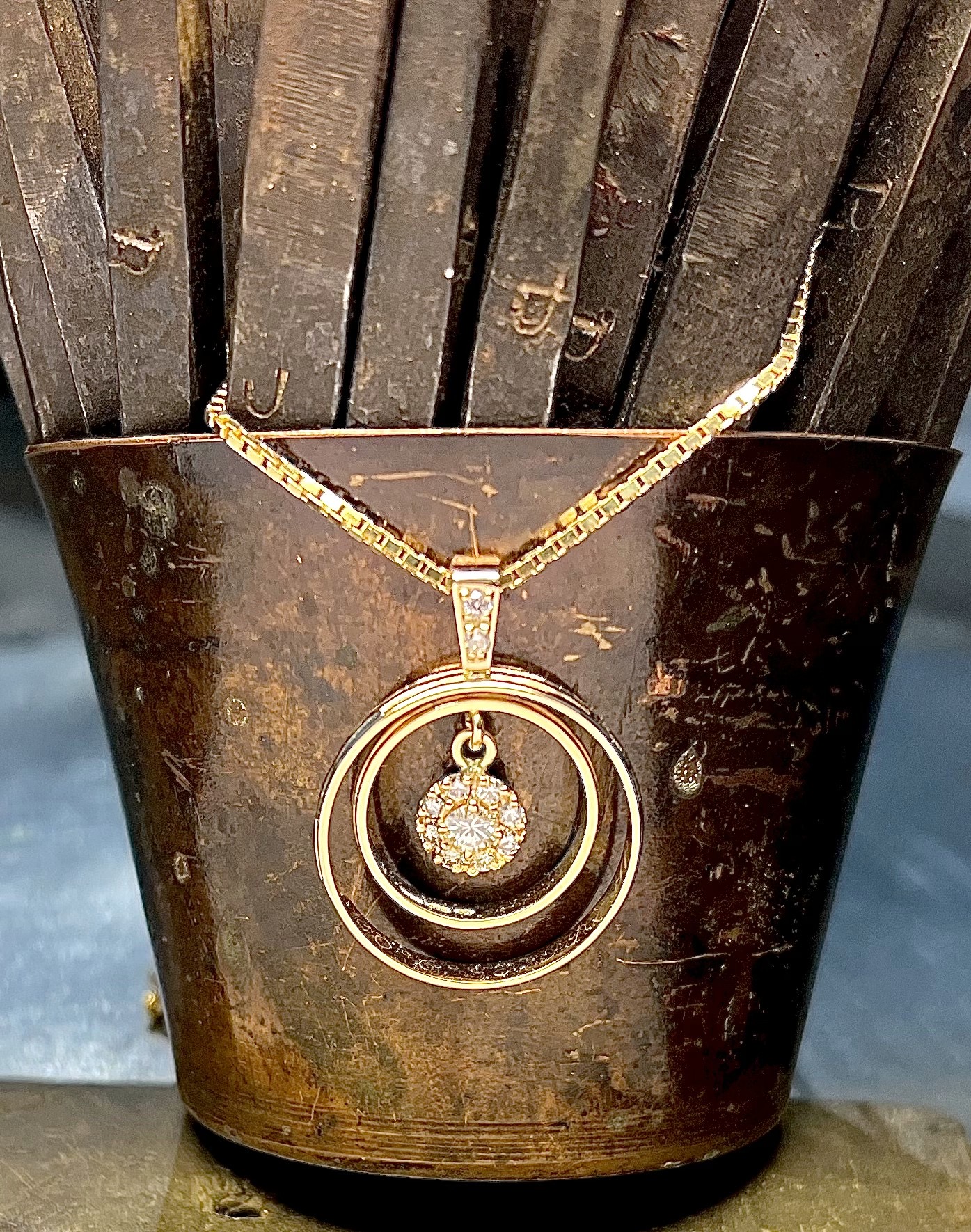 Sirkalla oli pitkään mielessä aivan erityisen korun teettäminen, joka toteutui vasta useamman vuoden odottelun jälkeen. Lopulta hän tuli luokseni mukanaan oma kihla- ja vihkisormus, sekä miehensä kihlasormus, joka oli jäänyt käyttämättömäksi aivan liian aikaisin. Noista sormuksista hän halusi teettää tyttärelleen muistoriipuksen, johon liittyi myös vuosien odottelu. Sirkka halusi antaa ajan kulua, ennen kuin ehdottaa surulliseen asiaan liittyvän muistokorun teettämistä, mutta 18 v. synttäreiden lähestyessä aika oli sopiva ja suunnitelma toteutettiin. Kihlasormukset säilytettiin kaiverruksia myöden sellaisenaan ja Sirkan sormus juotettiin hänen miehensä sormuksen sisään. Sirkan vihkisormuksesta otettiin irti timantit, joista kaksi istutettiin riipuksen lenkkiin ja lopuille tehtiin kiviosa sormusten keskelle. Kiviosan keskimmäinen, muita suurempi timantti on peräisin Isän äidin vanhasta sormuksesta, joka lisää – jos mahdollista – riipuksen tunnearvoa entisestään.