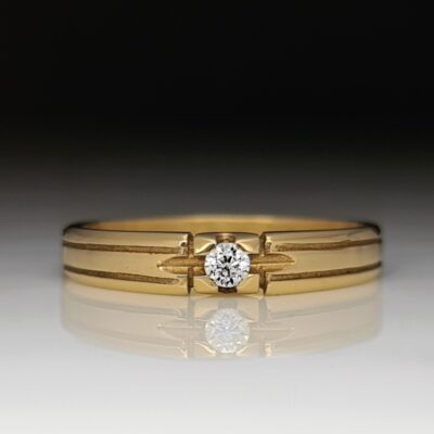 Yksikivinen timanttisormus, joka on valmistettu matalaksi ja käytännölliseksi. Sormuksen vahvassa rungossa yksinkertaiset ilmettä antavat koristeet. Kaikki oman mallistomme sormukset on saatavana myös värikivillä tai esim. mustilla timanteilla.