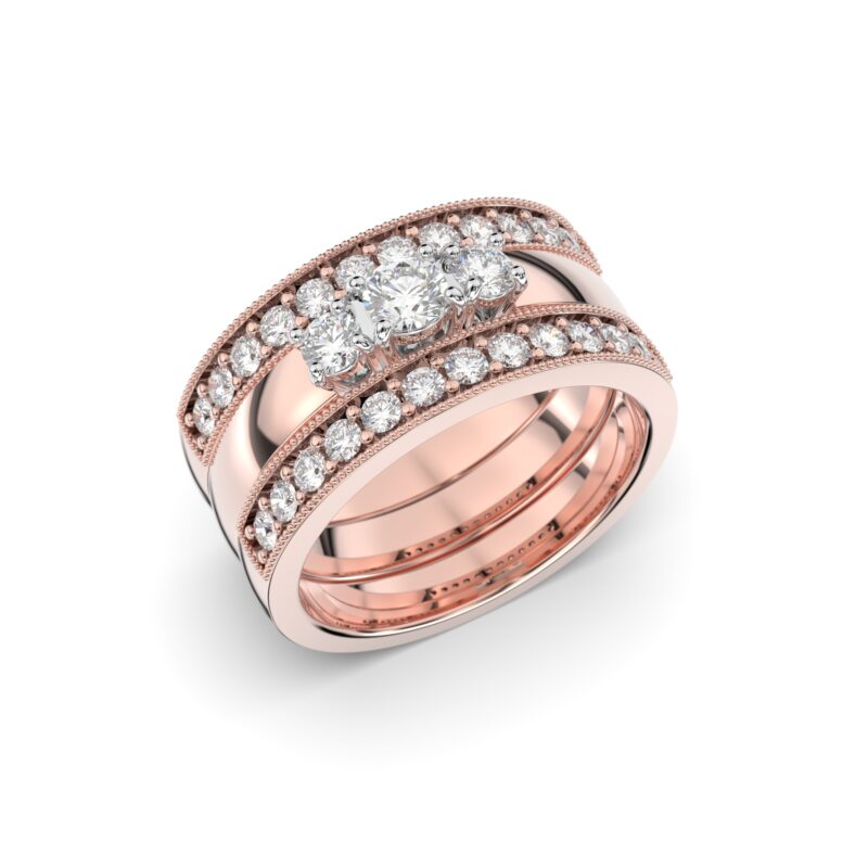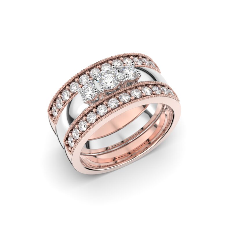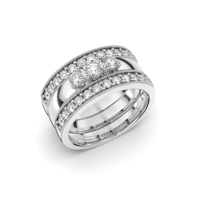 Upea Festive Ariel-timanttisormus joka mnuodostuu kolmesta sormusrungosta. Sormuksen uloimmissa rungoissa on yhteensä 24 näyttävää briljanttihiottua timanttia. Keskimmäisessä rungossa briljanttihiottuja timantteja on kolme. Sormuksessa on myös kauniit pitsireunukset