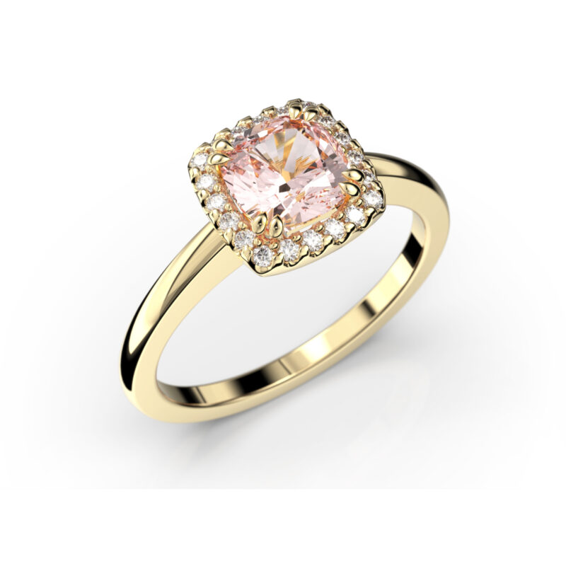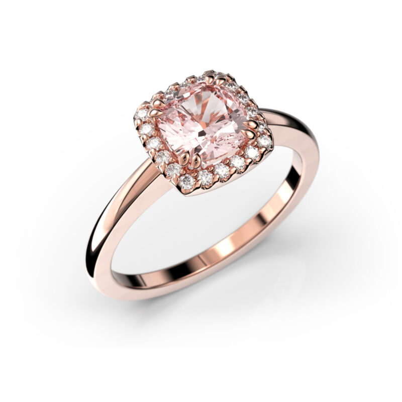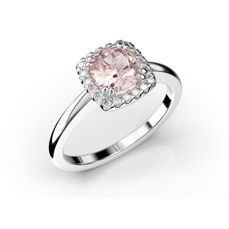 Tyylikäs ja moderni ”halo” sormus keskipisteenään cushion-hiottu morganiitti, jota ympäröi säihkyvät timantit. Elsa timanttisormus sopii käytettäväksi joko yksinään tai toisen sormuksen rinnalla.