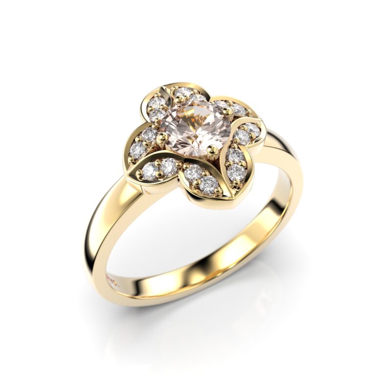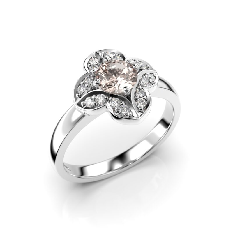 Näyttävän Festive Magnolia-sormuksen keskellä kimaltelee vaaleanpunainen morganiitti, jonka ympärille on istutettu 16 pienempää timanttia kauniiseen kukkamaiseen muodostelmaan. Runko on vahva, kevyesti pyöristetty. Tämä sormus sopii käytettäväksi yksinään sekä yhdistettynä toisen sormuksen rinnalle. Yhteensopiva malli seuraavien Festive sormusten rinnalle: Edith,