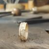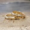 Asiakkaani kihla- ja vihkisormus oli jääneet pieniksi ja siksi olleet käyttöä vailla jo vuosia. Hän halusi asiaan muutoksen ja toi sormukset koon muutokseen. Samalla hän halusi sormuksiin uutta ilmettä, joten kivetön kihlasormus halkaistiin ja puolikkaat juotettiin timanttisormuksen molemmille puolille.