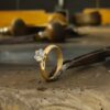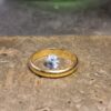 Suvin kultainen perintösormus ja miehen suvun puolelta saatu korukivi kohtasivat tositarkoituksella ja täydentävät toisiaan nyt näin tyylikkäästi. Kivelle valmistui perinteinen "kruunukastikka" ja sormuksen alkuperäiset kaiverrukset säästettiin.