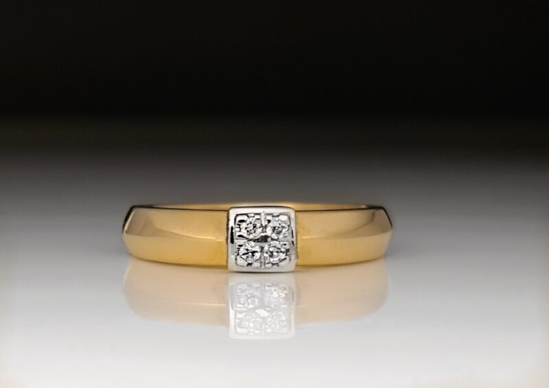Kaunis timanttisormus, joka neljällä timantilla on saatu näyttämään yksikiviseltä. Sormuksessa on perinteistä poikkeava keskeltä korkeampi, kulmikas runko. Kaikki oman mallistomme sormukset on saatavana myös värikivillä tai esim. mustilla timanteilla.