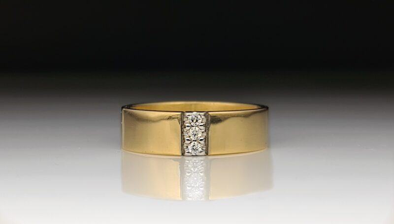Yksinkertaisen tyylikäs flakkarunkoinen timanttisormus, jonka timanttirivi on poikittain runkoon istutettu. Leveä ja vahva runko ei pelästy kovempaakaan käyttöä. Kaikki oman mallistomme sormukset on saatavana myös värikivillä tai esim. mustilla timanteilla.