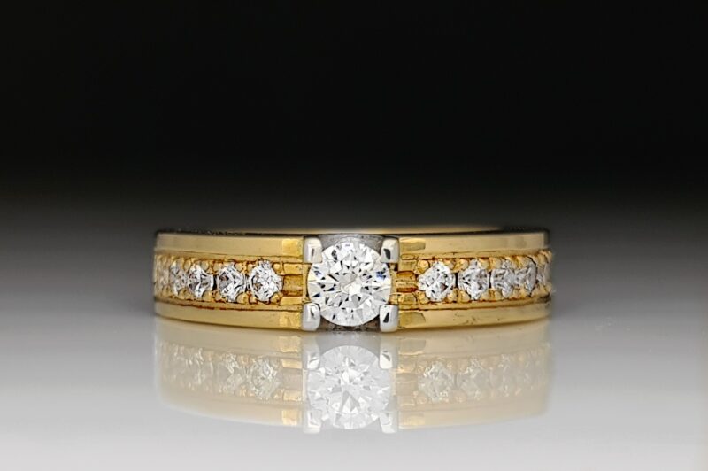 Timanttisormus, jossa keskellä isompi neljällä kynnellä istutettu timantti. Reunoilla suoraan runkoon istutettu yhteensä kymmenen timanttia. Kaunis ja tyylikäs klassikko. Kaikki oman mallistomme sormukset on saatavana myös värikivillä tai esim. mustilla timanteilla.