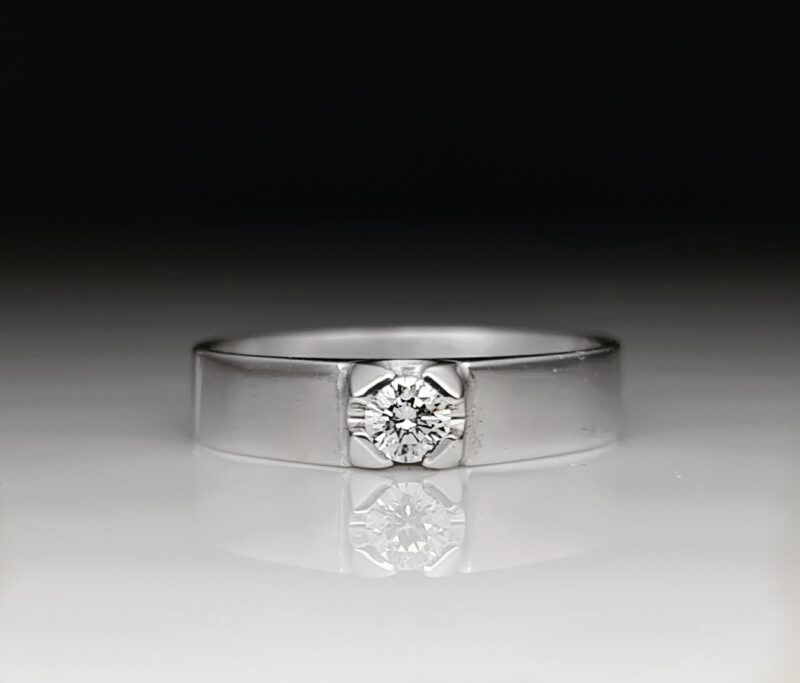 Kaunis timanttisormus, jonka kukkamainen neljän kynnen istutus tuo timantin tyylikkäästi esiin. Sormuksessa on perinteistä poikkeava keskeltä korkeampi, kulmikas runko. Kaikki oman mallistomme sormukset on saatavana myös värikivillä tai esim. mustilla timanteilla.