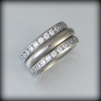 ”Allianssi” titaanisormus zirkoneilla, jossa miellyttävästi pyöristetty sisäpuoli, sekä käytännöllinen ja tarttumaton kivien istutus. Allianssisormuksessa on kiviä ympäri koko sormuksen. Sormuksen leveys 3,0 mm.